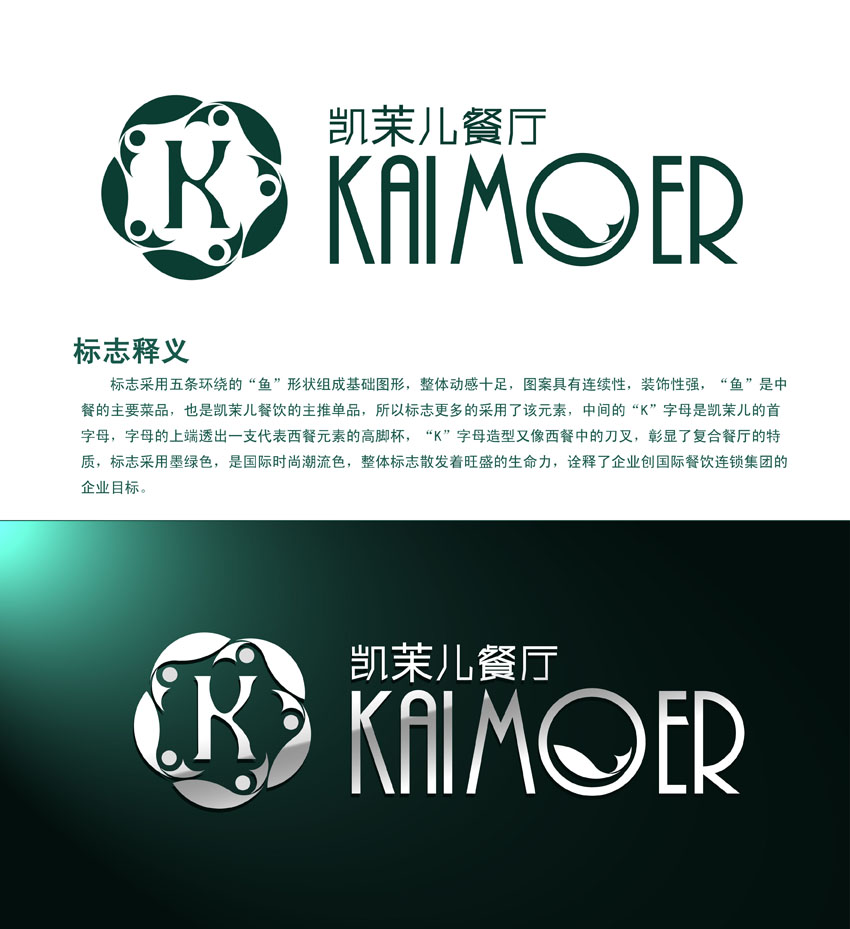 案例介紹:標(biāo)志采用五條環(huán)繞的“魚(yú)”形狀組成基礎(chǔ)圖形,整體動(dòng)感十足,圖案具有連續(xù)性,裝飾性強(qiáng), “魚(yú)”是中餐的主要菜品,也是凱茉兒餐飲的主要單品,所以標(biāo)志更多的采用了該元素,中間的“K”字 母是凱茉兒的首字母,字母的上端透出一支代表西餐元素的高腳杯,“K”字母造型又像西餐中的刀叉, 彰顯了復(fù)合餐廳的特質(zhì),標(biāo)志采用墨綠色,是國(guó)際時(shí)尚潮流色,整體標(biāo)志散發(fā)著旺盛的生命力,詮釋了企 業(yè)創(chuàng)國(guó)際餐飲連鎖集團(tuán)的企業(yè)目標(biāo)。